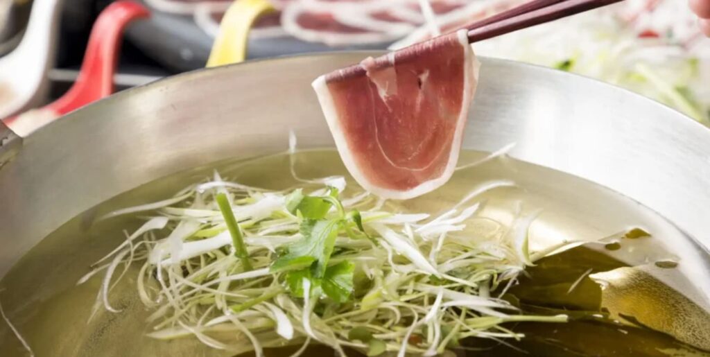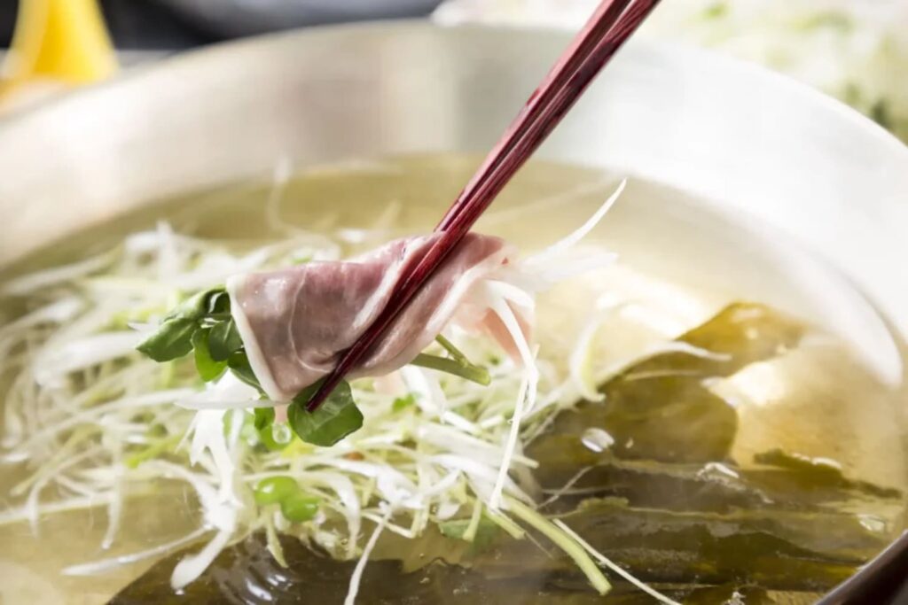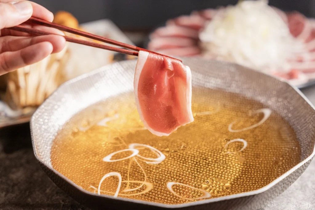 0.8ミリの極薄にカットした鴨肉を、丁寧に取ったこだわりの黄金出汁に”7秒間”くぐらせます。