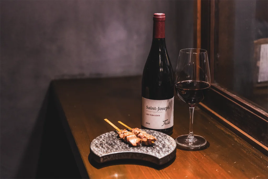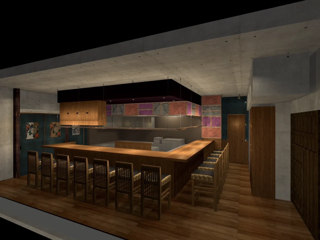 重厚感のある一枚板のカウンターを中心に、やわらかな照明が静かに広がり、訪れる人をゆったりとした時間へと誘います。天井のコンクリート素材やアクセントとなる色彩で、洗練された雰囲気を演出。目の前で焼き上げられるライブ感を楽しめるカウンター席では、大人のひとときをお過ごしください。