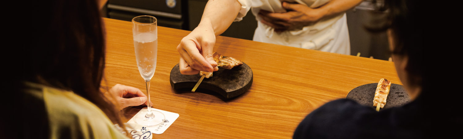 ご友人との食事や、大切な人とのデートには、焼師が目の前で焼き上げるオープンキッチンで創る美味しい焼鳥や、旬の野菜の料理、そして料理に合うお酒を楽しんでいただけます。
