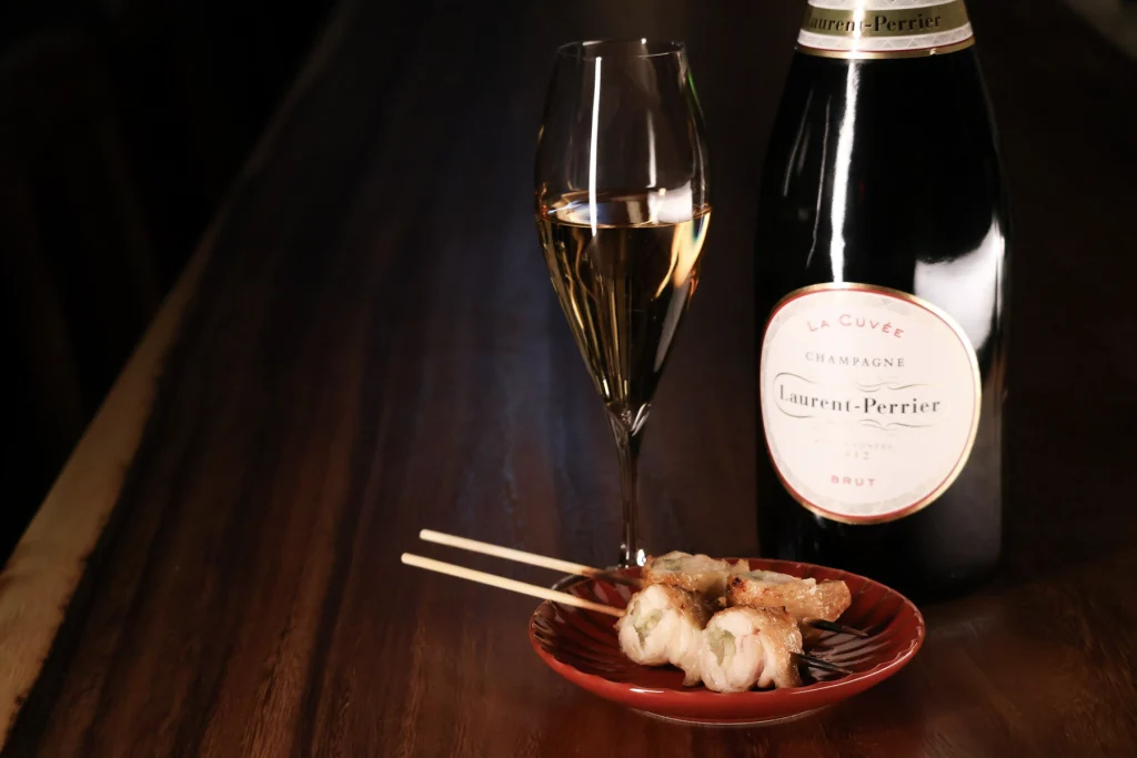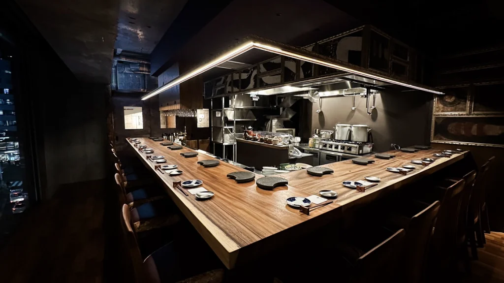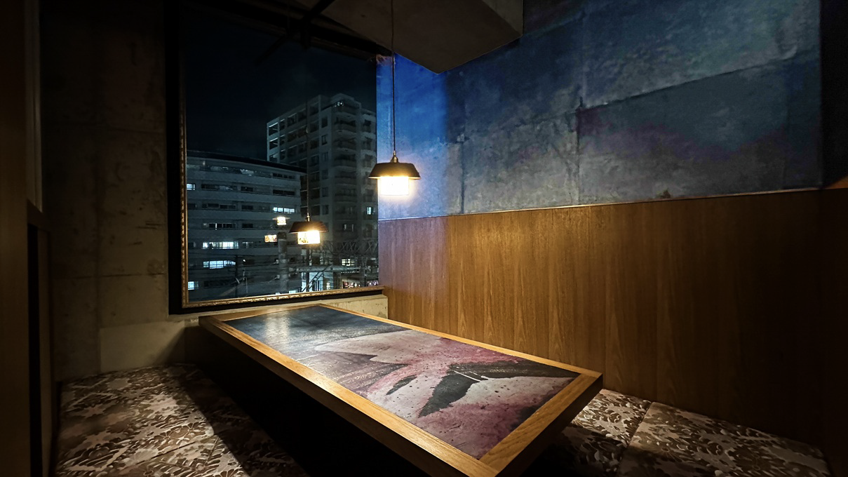 重厚感のある一枚板のカウンターを中心に、やわらかな照明が静かに広がり、訪れる人をゆったりとした時間へと誘います。天井のコンクリート素材やアクセントとなる色彩で、洗練された雰囲気を演出。目の前で焼き上げられるライブ感を楽しめるカウンター席では、大人のひとときをお過ごしください。